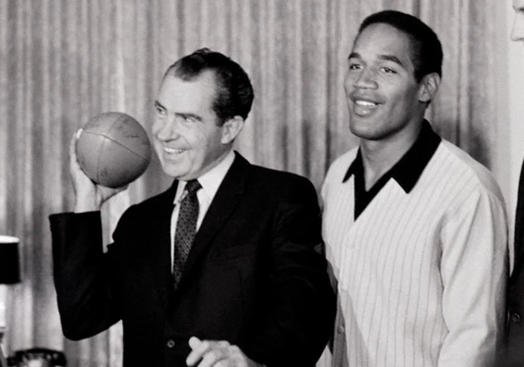 In antithesis to the paradigm of the politically engaged African-American athlete, we can find a typology of athlete that could be defined as post-racial: in its eliding and supposedly going beyond the racial question, this narrative category qualifies blackness itself as an obstacle and disadvantage, giving way to a fantasy of racial transcendence[9] that relies on stereotypes and archetypes capable of confirming racist trajectories precisely by inverting ‘normal’ racist expectations. An example of this formula is the archetype of the exceptional negro, with superhuman (or beastly?) athletic and physical prowess, which was often used to portray OJ the athlete, as fast as the wind, as powerful as a hurricane: the same speed that allowed him to run the iconic 64-yard dash against UCLA made him the perfect profile for the famous 1978 Hertz commercial. The image projected by OJ in this short video delineates him as a model of harmless, friendly blackness: smartly dressed, he advertises the same cars that, when associated with African-Americans, are most likely to be juxtaposed with stories like that of George Floyd[10]. He is a black man, but he alienates himself from his blackness: he might as well be a white man.