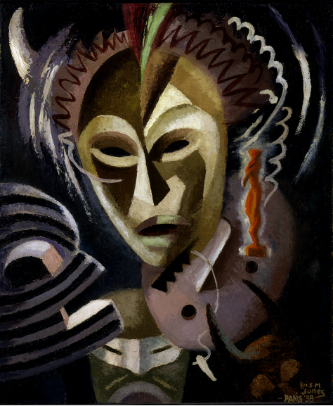 Arriving in Paris in 1937, Loïs Mailou Jones first painted scenes of Parisian life before signing one of her best-known paintings, Les Fétiches, in 1938. Inspired by the artefacts the artist discovered in France, the modernist-style canvas reveals five floating masks against a black background. In Harlem Renaissance: Art of Black America (1994), the painter and writer David Driskell points out that this encounter with African art in colonial territory gave African-American artists a new awareness of their own diasporic heritage. However, the interest in these objects presented through a white lens questions the way in which Harlem Renaissance artists were able to address a purloined legacy of African culture.