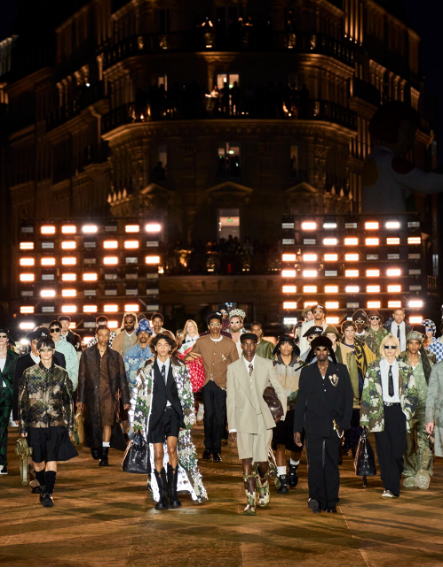Firstly, through collaborations with French luxury brands. Succeeding the late Virgil Abloh, Pharrell Williams entered this institution as the new designer for the men's collection. This unprecedented arrival allowed an African American, a man of hip hop and a fashion lover, to challenge the elegance “à la française”, by shedding light on a culture that has long been stigmatised and discriminated against for being too ghetto, too black. His 2024 Men Spring-Summer Collection made hip hop taking the center stage of the Parisian fashion world, with a streetwear runaway putting on the foreground the “traces of hip hop golden age”[16].
