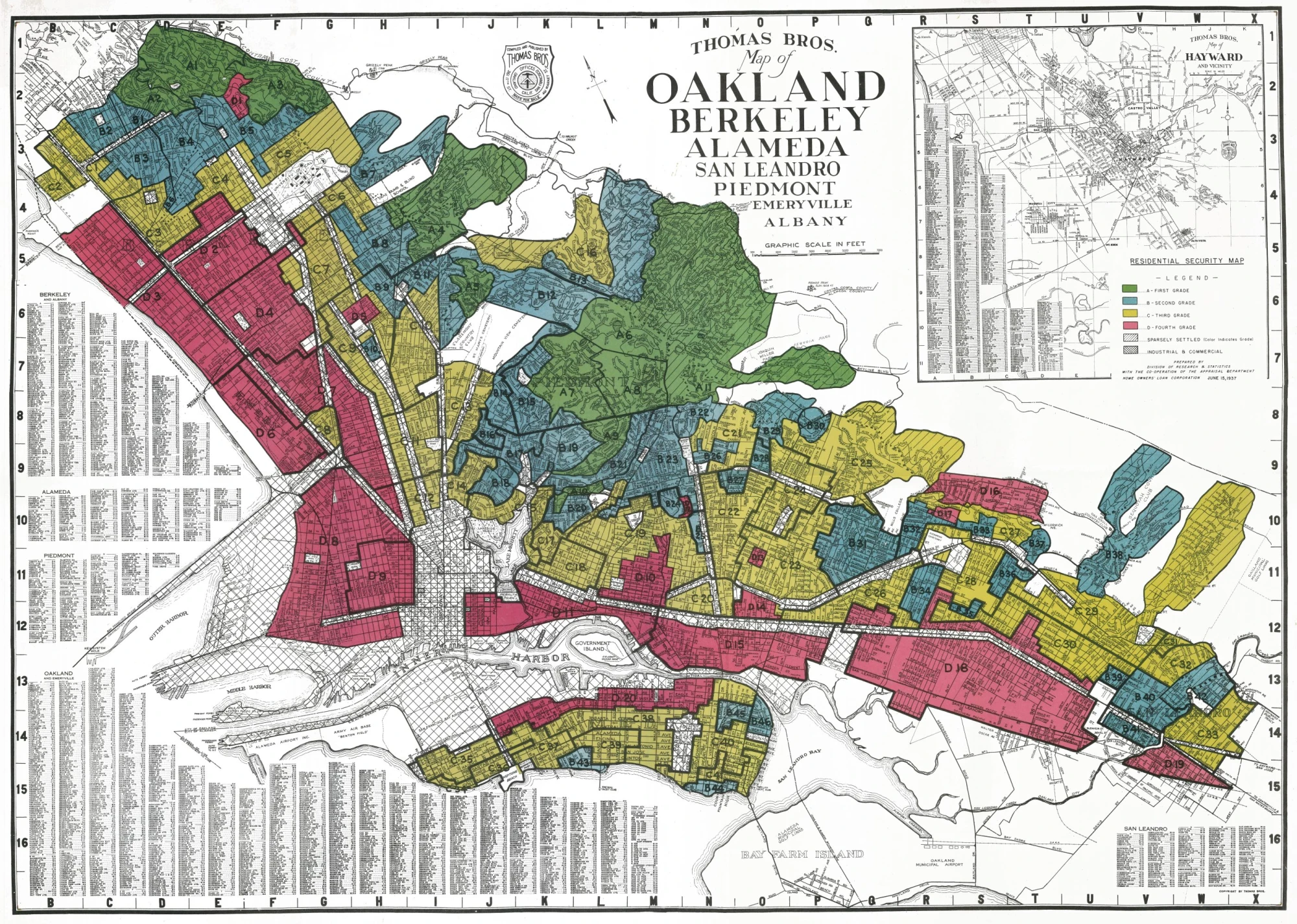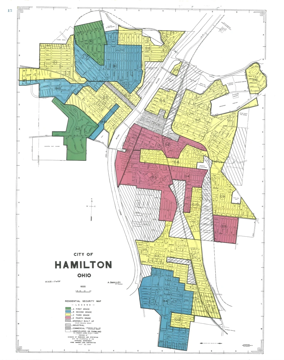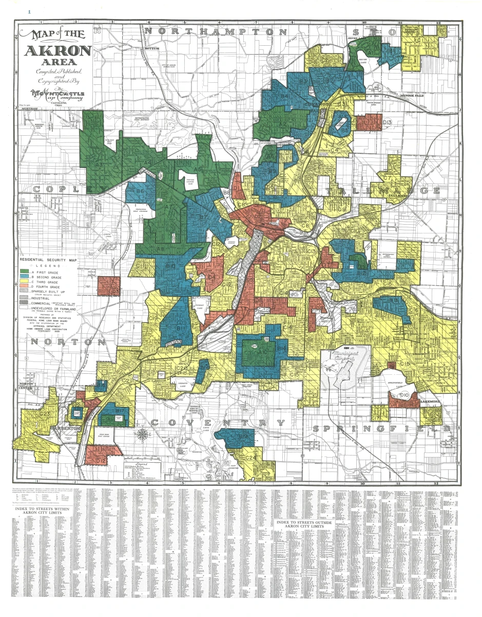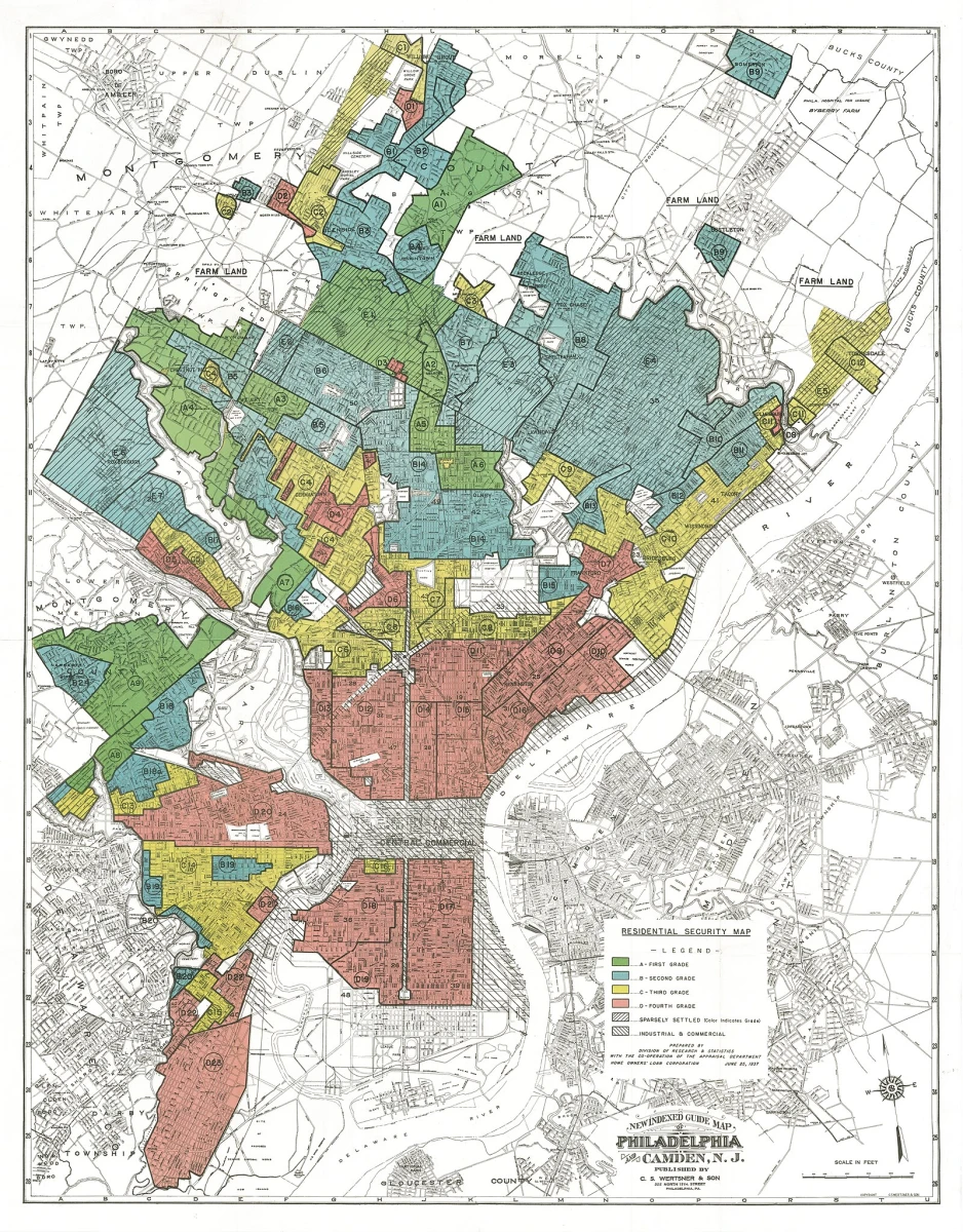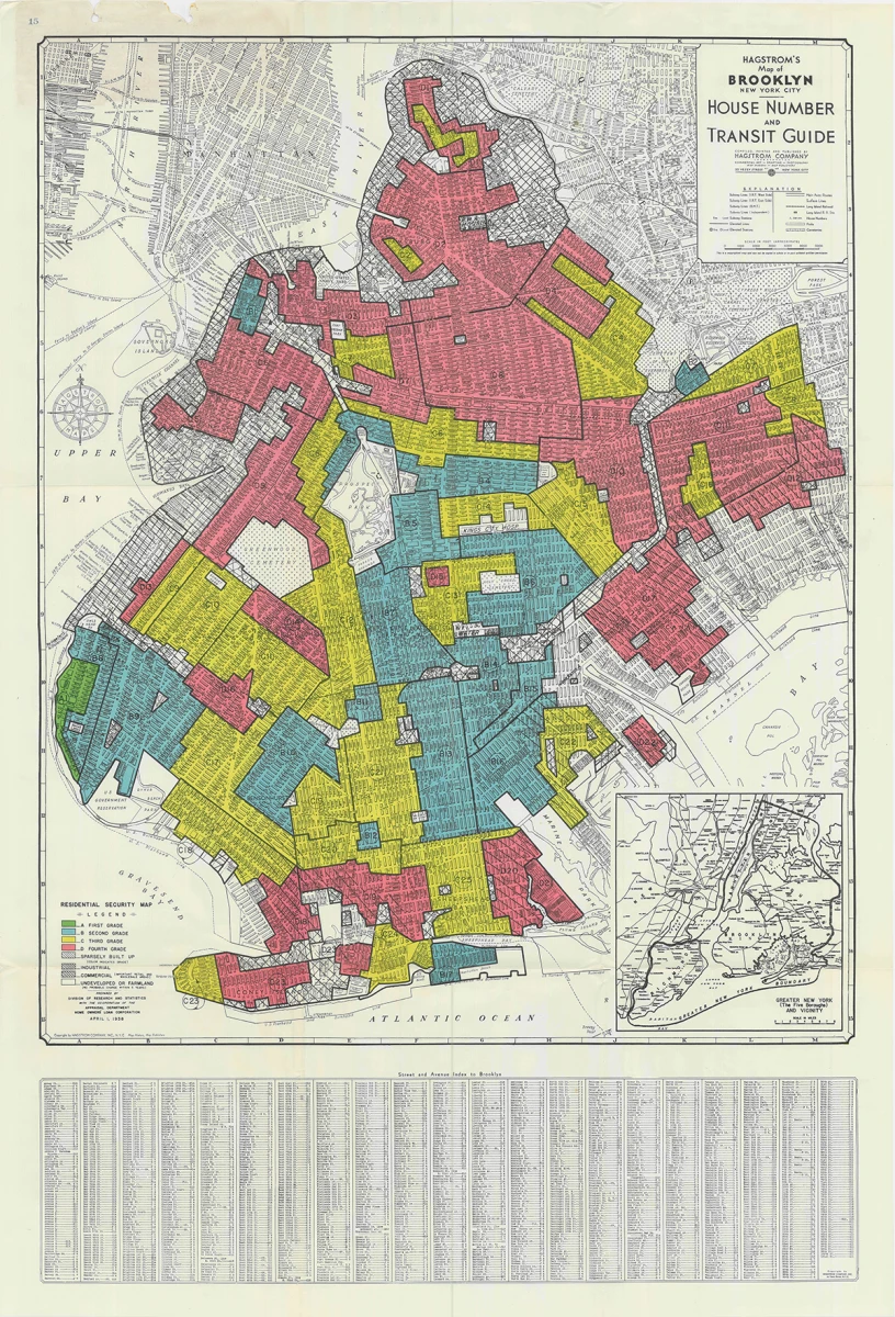 This is how we arrive at what would later be called redlining. In the 1930s, the HOLC began producing so-called Residential Security Maps: city maps in which neighbourhoods were classified according to their financial “reliability.” Green indicated the “best” areas, blue those that were still considered solid, yellow those “in decline”, and red those considered hazardous. Can you guess the racial composition of the hazardous areas?